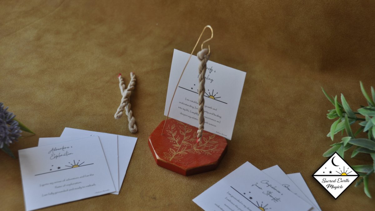 A handcrafted clay tray with a subtle wire hook, designed to elegantly burn Nepalese incense. This unique design creates a gentle, aromatic experience that sets a peaceful tone. The clever groove in the tray holds 7 mantra cards written by a respected yogi.
